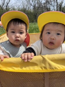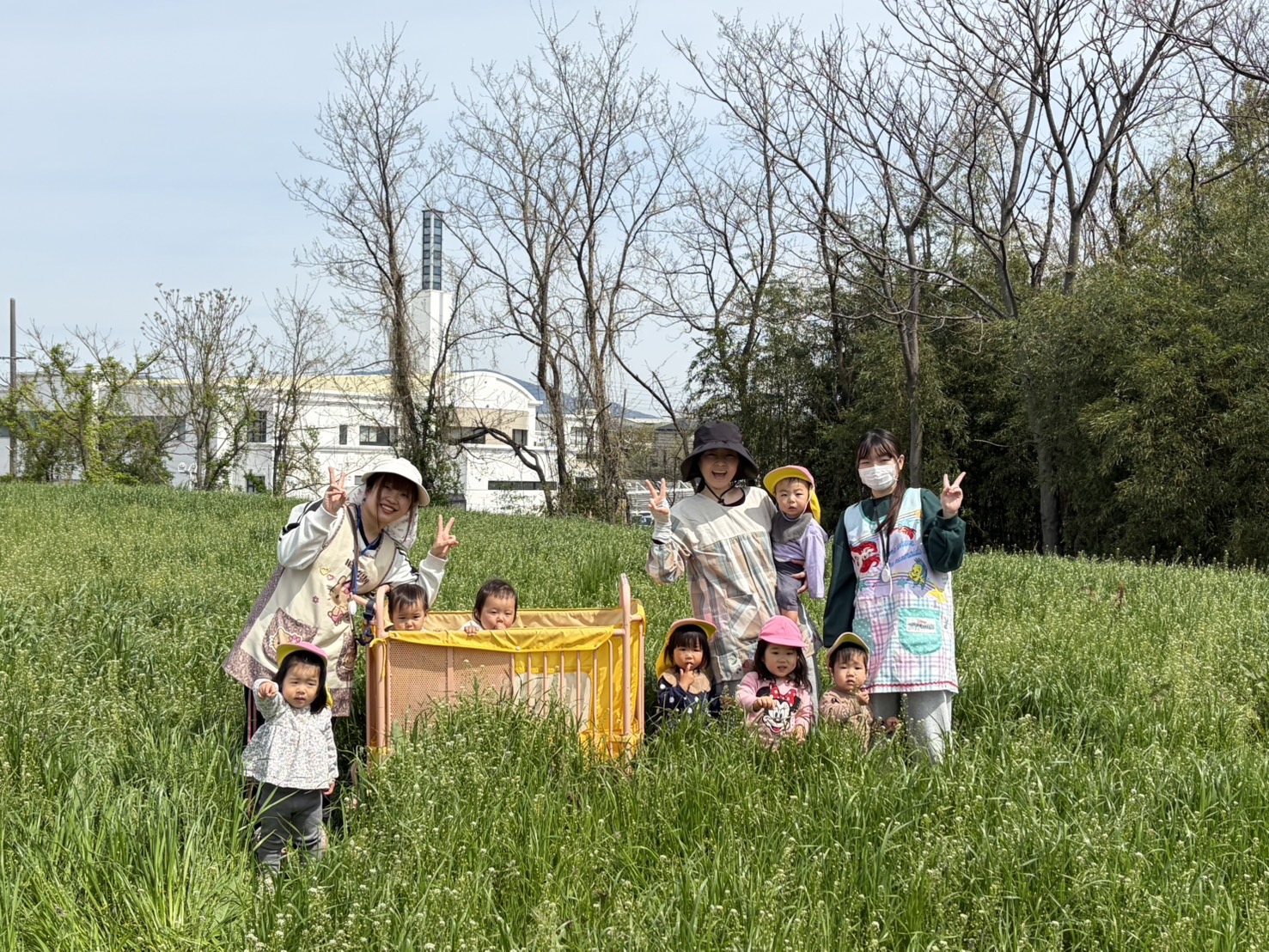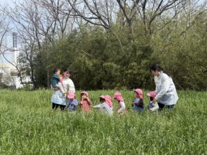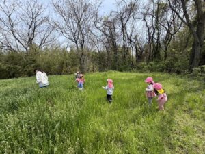 こども園の近くにある電車が見える場所に行き、自分の背丈より高い草をかき分けて冒険したり、電車を見たりしながら元気いっぱい走り回っていました。